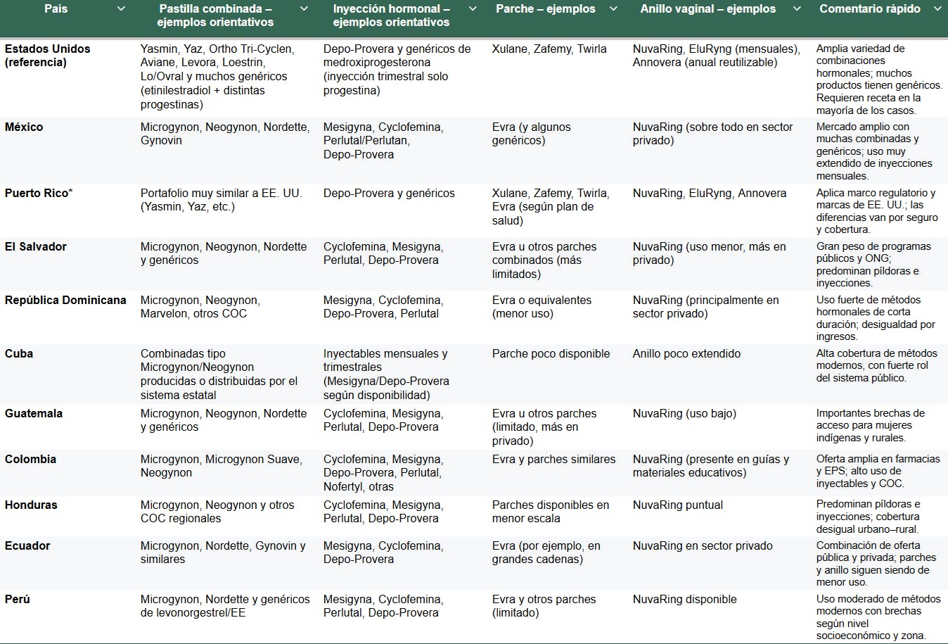 La siguiente tabla resume, de forma orientativa, algunos ejemplos de marcas de anticonceptivos hormonales que se han usado en los 10 principales países de origen de personas hispanas en Estados Unidos (México, Puerto Rico, El Salvador, República Dominicana, Cuba, Guatemala, Colombia, Honduras, Ecuador y Perú), y los métodos equivalentes en EE. UU.